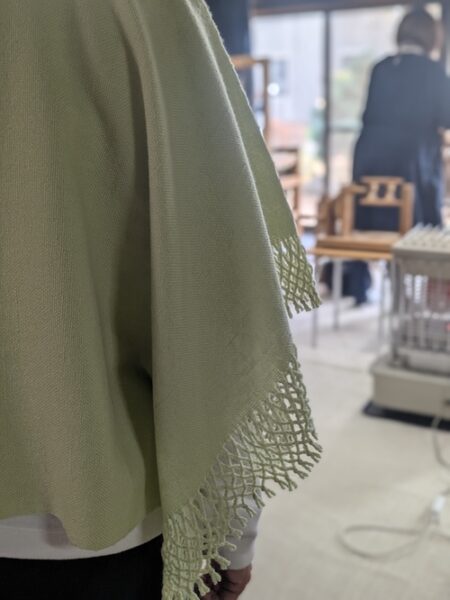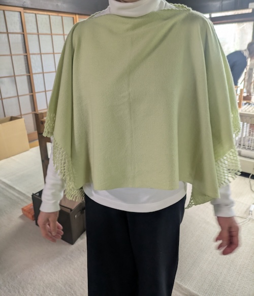 午前中は、一旦手を止め生徒さんの仕上げが終わった新作【被るポンチョ】のお披露目会。