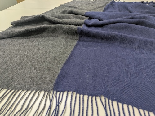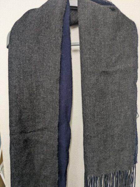 ↑二重織りの作品は、広げると80cmほどあり左右で色を変えた肌触りのよい広幅のショールとなりました。
