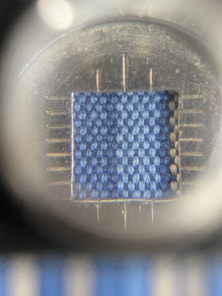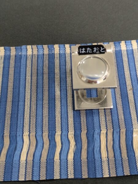 分解鏡を覗いて、たて糸・よこ糸の密度や、縞の本数を確認…