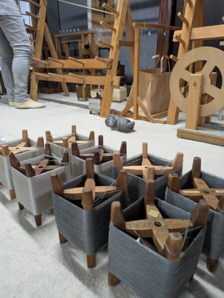 ↑真綿をつかってショールの準備中。糸を巻きこれから整経です。